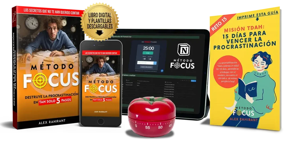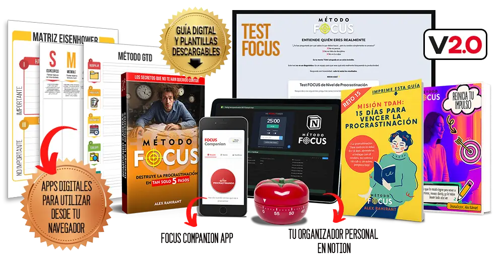 El MANUAL DEL MÉTODO FOCUS con los 5 pasos secretos para una vida sin estrés y libre de procrastinación con ejercicios prácticos.