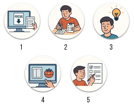 Nuestro Método FOCUS te entrega la guía exacta para mejorar tu entorno de estudio o trabajo y ser mucho mas eficiente en tus actividades diarias, finalizar en menos tiempo y disfrutar de mas espacio libre para tí.